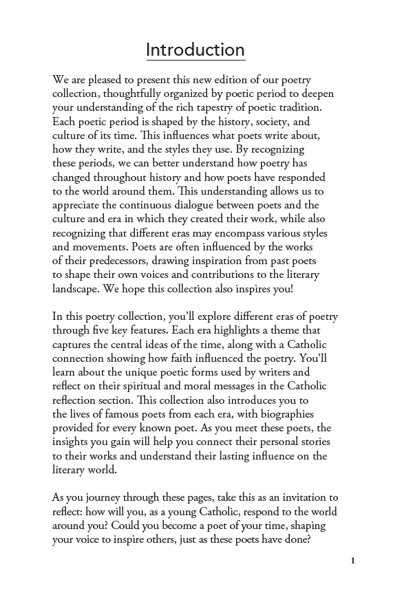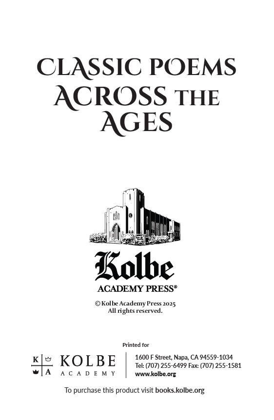 Classic Poems Across the Ages is a comprehensive poetry reader designed to introduce students to the great tradition of Western literature through carefully selected poems and guided instruction. Rather than presenting poems as isolated pieces, the book leads students chronologically from the ancient world to the modern era, showing how each age expressed its understanding of beauty, suffering, heroism, and faith through poetry.